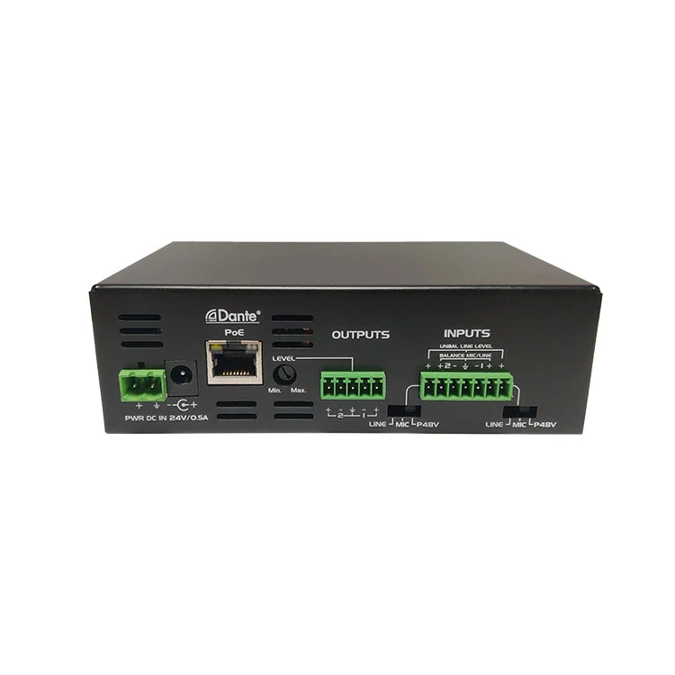 • Dual-rás hljóðbreyting-Breytir venjulegu MIC eða línu hliðstæðum hljóðmerki í Dante netstrauma.