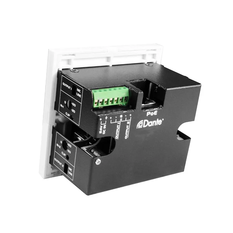 2CH Dante viðmót 2 MIC/Line Inputs x 2 Outputs viðmótspjald er fullkomið fyrir fagleg hljóðforrit, svo sem ráðstefnusalir, lifandi hljóðuppsetningar, útvarpsstöðvum og uppsettum AV-kerfum, þar sem áreiðanlegt Dante-til-analog og hliðstætt til-dante umbreyting er krafist í samhliða, rack-frjálsri formstuðul. Veggfest hönnun þess gerir kleift að hreina og skilvirka samþættingu í ýmsum umhverfi en viðhalda hágæða hljóðárangri.